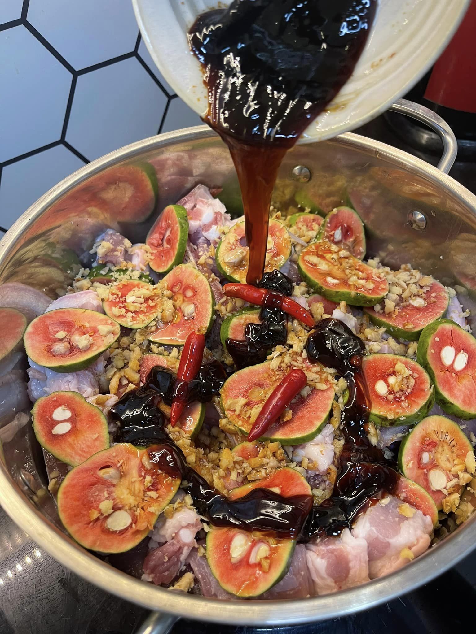 Thêm su hào vào rồi nêm gia vị, thêm cá tươi rồi đổ nước ngập cá, rồi cho quả chay vào cùng. Sau khi nước sôi thì cho nhỏ lửa, ninh 15 phút, dầm chay, chế thêm nước, vặn lửa to đun sôi lần nữa. Khi canh sôi cho thì là và hành vào là được.